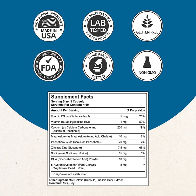 Vitamin D3 (as Cholecalciferol), Vitamin B6 (as Pyridoxine HCl), Calcium (as Calcium Carbonate and Dicalcium Phosphate), Magnesium (as Magnesium Amino Acid Chelate), Phosphorous (as Dicalcium Phosphate), Zinc (as Zinc Gluconate), Sodium (as Sodium Chloride), DHA (Docosahexaenoic Acid) Powder, and 5-Hydroxytryptophan (from Griffonia simplicifolia Seed Extract)