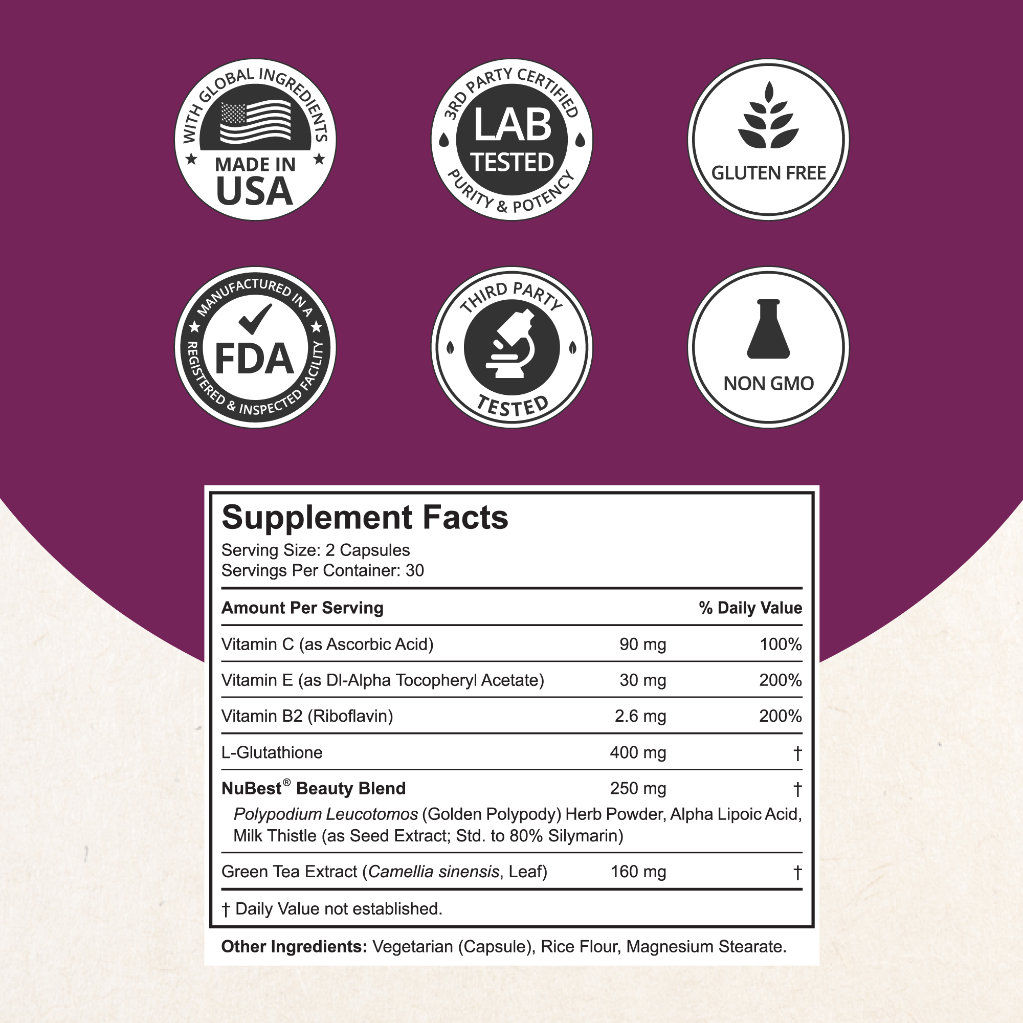 Vitamin C (as Ascorbic Acid), Vitamin E (as Dl-Alpha Tocopherol Acetate), Vitamin B2 (Riboflavin), L-Glutathione, Polypodium Leucotomos (Golden Polypody) Herb Powder, Alpha Lipoic Acid, Milk Thistle (as Seed Extract; Std. to 80% Silymarin), Green Tea Extract (Camellia sinensis, Leaf).